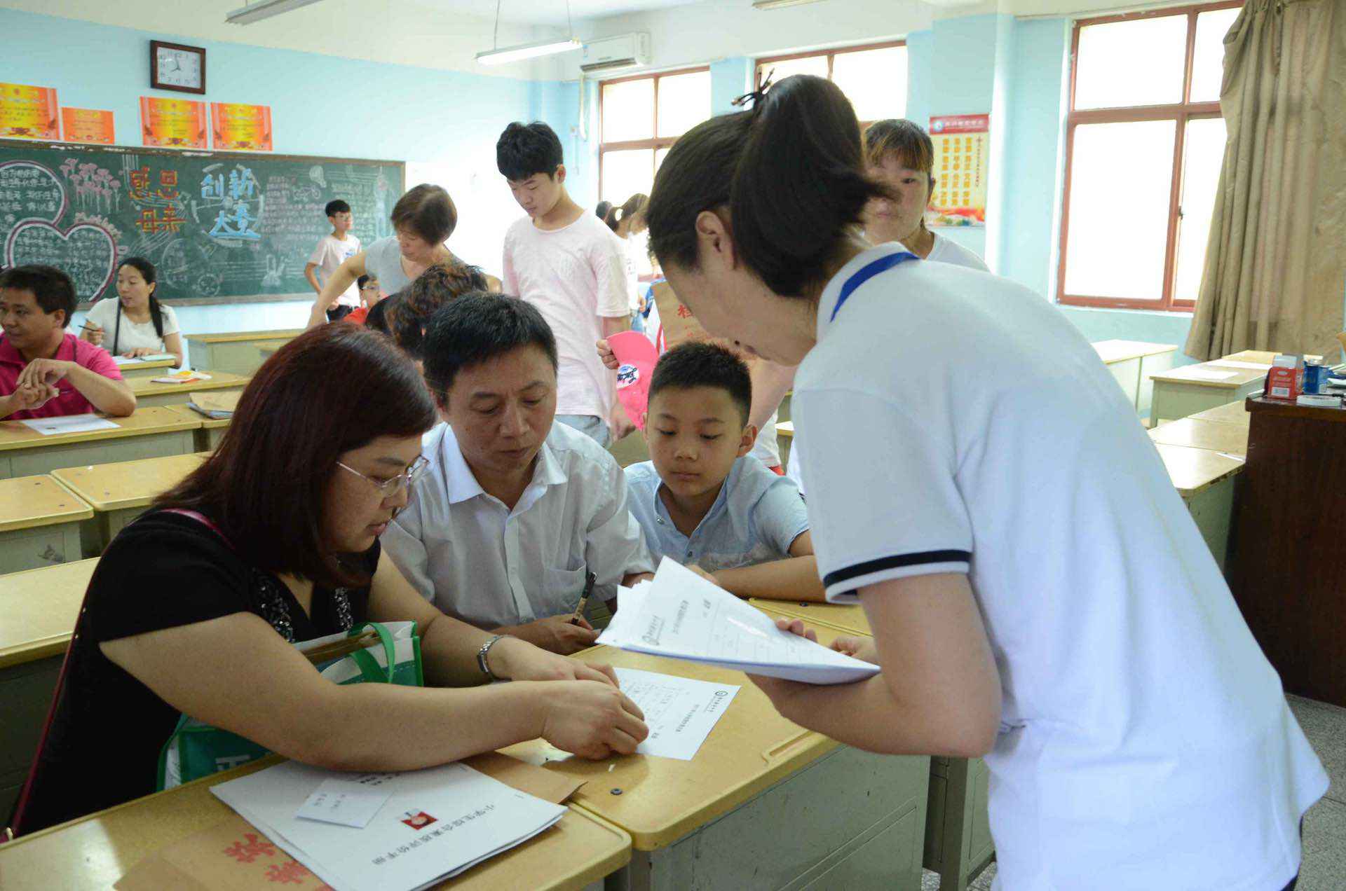 天气炎热,为避免家长在校外排队时间过长,学校开放一楼阶梯教室为家长等候室。家长和学生依据走读或者住校这两种报考类别,分别选择在相应的等候室稍事休息,然后跟随引导老师进入填表室填写招生登记表。