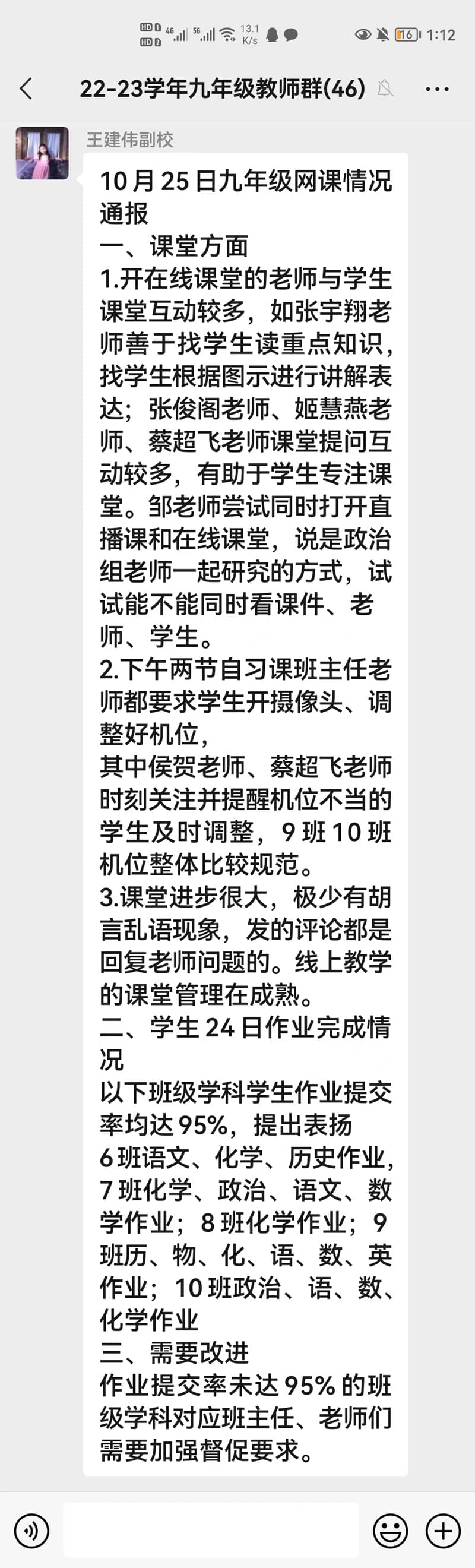 自开始线上教学以来,我校依据实际情况迅速启动线上巡课制度、集体备课、教研活动等方案,并提出详细的要求。每日都在工作群反馈当天网课的情况,宣传鼓励老师好的做法,反思线上教学和学生管理中存在的问题,并一对一点对点反馈、整改,以保证网课期间的教育教学和学生管理高质高效。
